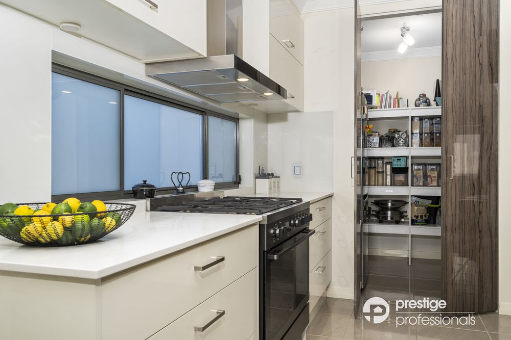 - Stunning modern kitchen complete with stone waterfall bench tops, gas hob & pyrolytic oven, stainless steel appliances, remote outdoor blind on kitchen window & large walk-in pantry with space for 2nd fridge