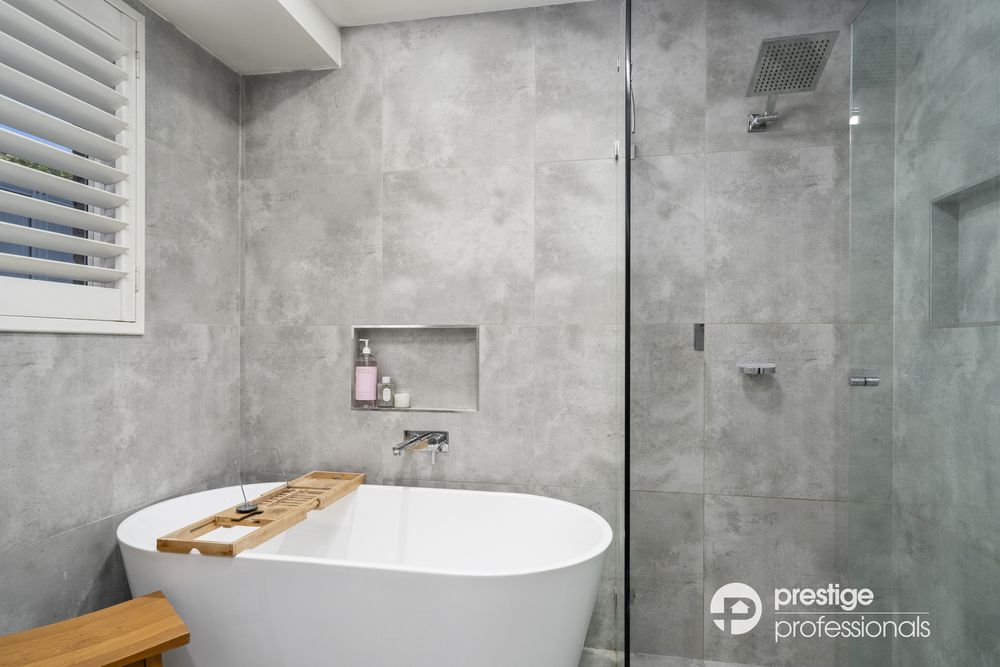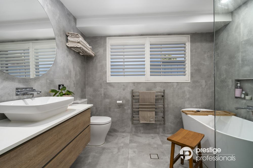 Exceptional extras include ceiling fans, downlights, ducted air-conditioning, plantation shutters, sophisticated timber flooring, and an energy-efficient solar panel system. Both bathrooms are luxuriously renovated, with the main bathroom featuring heated flooring for added comfort.