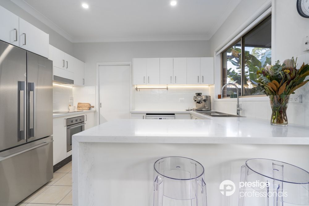 The heart of the home is a bright and airy separate lounge and dining area, leading to a state-of-the-art kitchen adorned with stone benchtops, chic LED strip lighting, and extensive cupboard space. Immaculate timber flooring and sophisticated downlights run throughout, adding a touch of elegance.