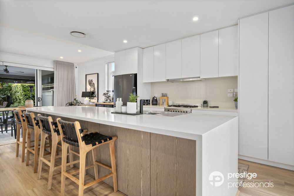The opulent master suite is a haven of tranquility, offering a walk-in robe, ensuite, secluded parents' retreat, and a private balcony, perfect for unwinding after a long day. The heart of the home is the gourmet chef's kitchen, equipped with premium fittings including waterfall stone benchtops, a vast island bench, gas cooking, and copious cupboard space.